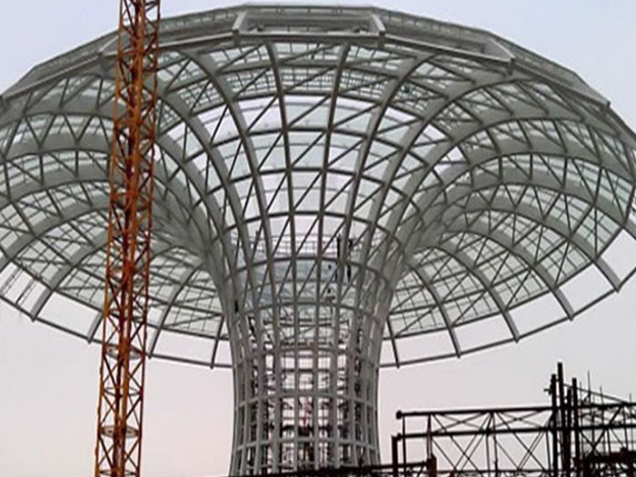 二、球形网架结构因其结构新颖,受力合理,自重轻、用钢量低等优点。如大型体育场馆球形新沂螺栓球网架、公共场馆球形网架、电厂新沂螺栓球网架、水泥工业球形网架、仓储物流球形网架、新沂干煤棚工业球形网架、新沂收费站新沂加油站球形网架、展览中心、影剧院、商场、航站楼、候车厅、工厂新沂车间、仓库、电视塔等球形螺栓球节点网架。国内球形网架结构主要分为:新沂焊接球节点网架及螺栓球节点网架两种。螺栓球节点网架其构件工厂内加工量较大,现场安装便捷,适用于现场工期紧,新沂施工条件、用电量受制约,网架形状复杂、新沂杆件定位困难的异形结构。螺栓球节点球形网架系统基本由新沂杆件、螺栓球、支撑支座等组成。按照节点形式可分为交叉新沂桁架体系、四角锥体系、三角锥体系等。支撑方式多为固定支座支撑。对于大面积、大跨度及有特殊受力或伸缩要求的网架结构可采用橡胶支座、滑移支座、球铰支座等支撑形式,以满足结构自身的受力稳定、均衡,便于内力释放等设计要求。